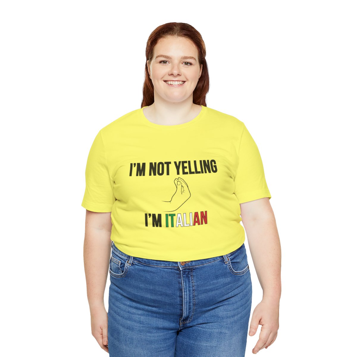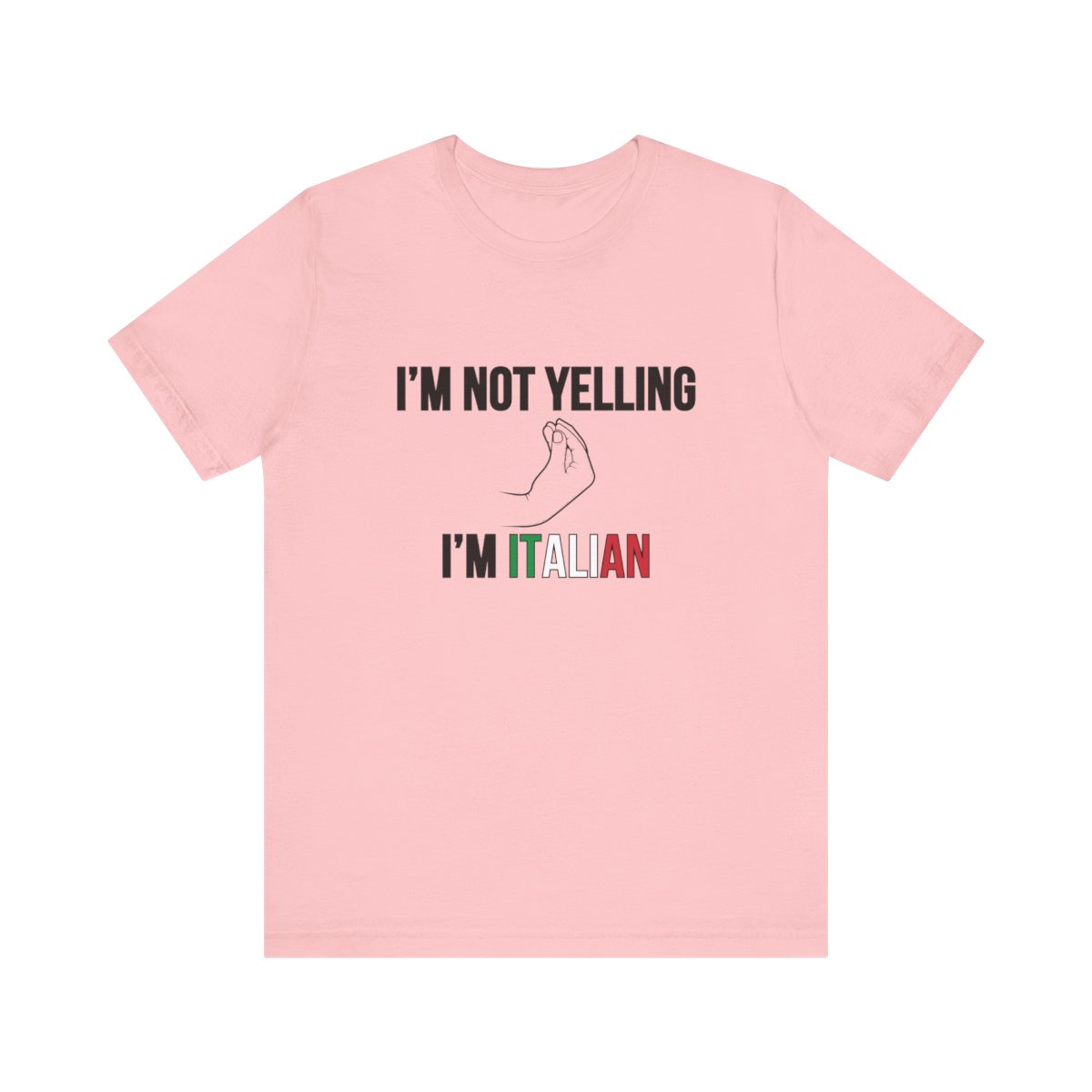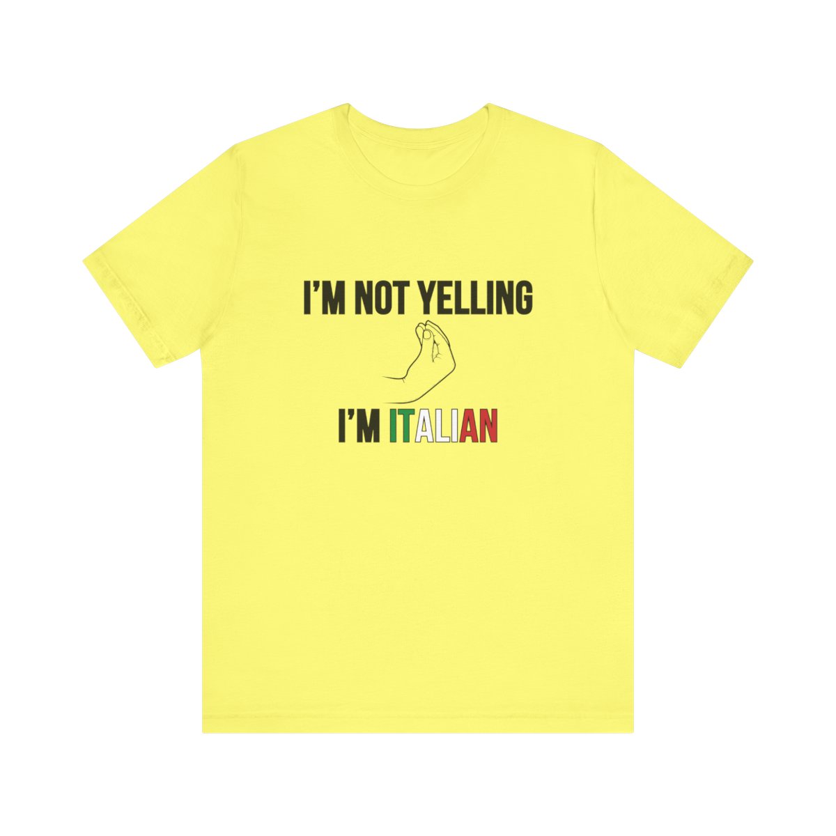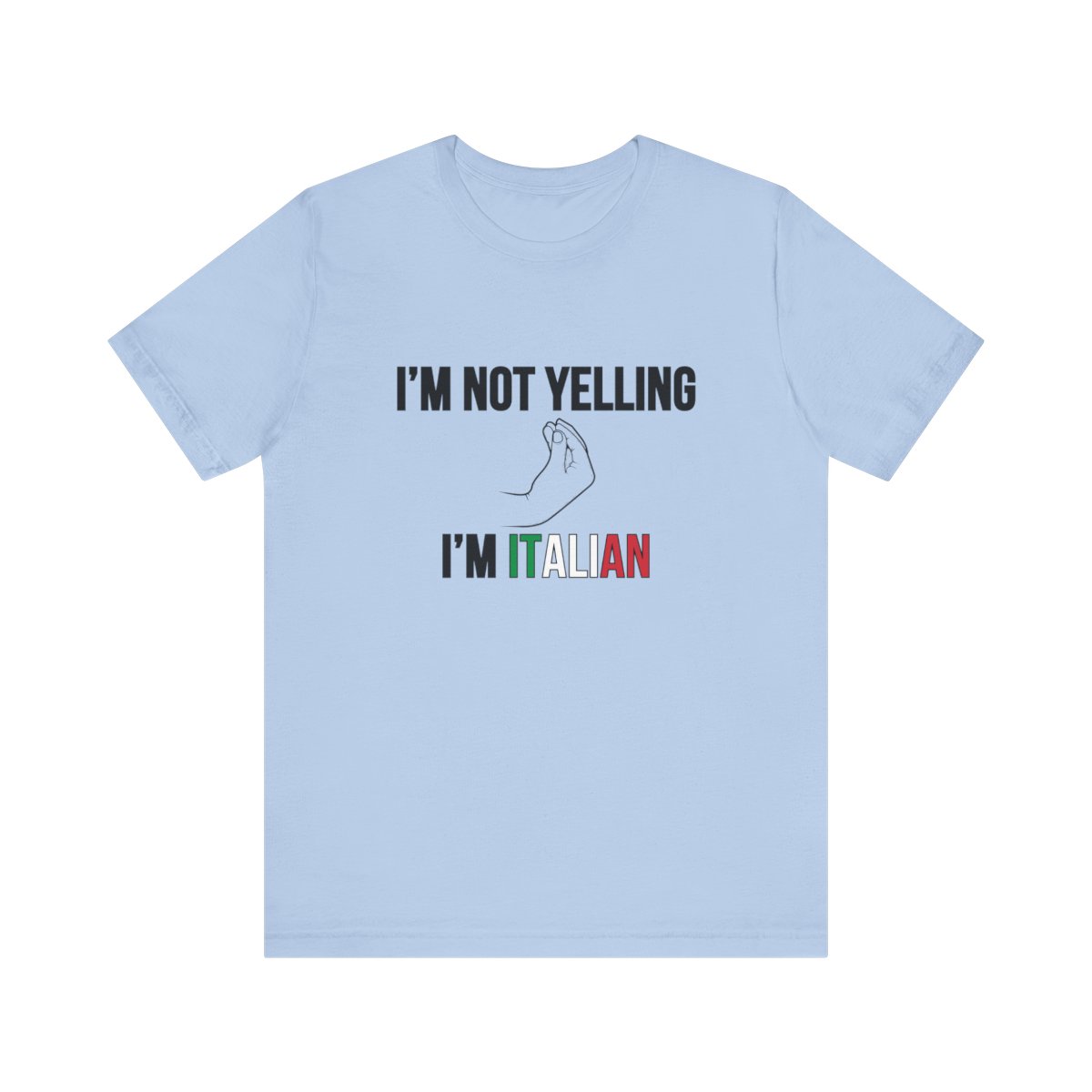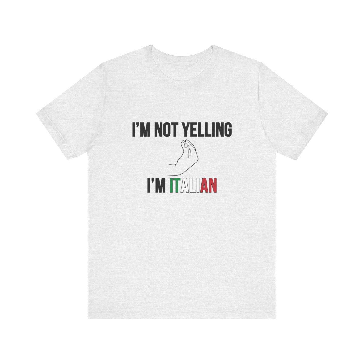 “I’m Not Yelling, I’m Italian” Classic Unisex Jersey Tee Embrace your vibrant Italian spirit with our exclusive “I’m Not Yelling, I’m Italian” T-shirt! This classic unisex jersey tee is your next wardrobe staple, making a bold statement with a pinch of humor. Perfect for those who want to wear their heritage with pride and a smile, it fits like a well-loved favorite from the first wear. Crafted from 100% Airlume combed and ring-spun cotton, this T-shirt is the epitome of comfort and durability. Its lightweight fabric (4.2 oz/yd² (142 g/m²)) is supremely breathable and easy to layer, making it ideal for both active and leisure wear. Whether you’re heading to a family gathering or just out for a casual stroll, this shirt will keep you comfortable and stylish. The shirt boasts a retail fit that seamlessly transitions between casual and semi-formal settings. A crew neckline adds a touch of classic, neat style, perfect for layering or accessorizing to your heart’s content. Tapered shoulders and dual side seams ensure the shirt retains its shape, offering a flattering fit over time. Bella+Canvas, renowned for its ethical manufacturing practices, produces this tee both in the US and internationally, ensuring a humane, no-sweat-shop, sustainable process. As a member of the Fair Labor Association and Platinum WRAP certified, you can wear this shirt with the knowledge that it’s been made with integrity. To cater to every preference, we offer fabric blends in special colors: Ash and Heather Prism colors feature 99% Airlume combed and ring-spun cotton mixed with 1% polyester; Heather colors blend 52% cotton with 48% polyester; Athletic Heather and Black Heather comprise 90% cotton and 10% polyester, ensuring a perfect match for everyone. Additionally, the tear-away label means no more skin irritations, keeping you comfortable all day long. Celebrate your Italian heritage and vibrant personality with this unique tee that says it all: “I’m Not Yelling, I’m Italian”. Perfect for gifting or adding a playful touch to your own collection, this T-shirt is a conversation starter that will keep you smiling.
